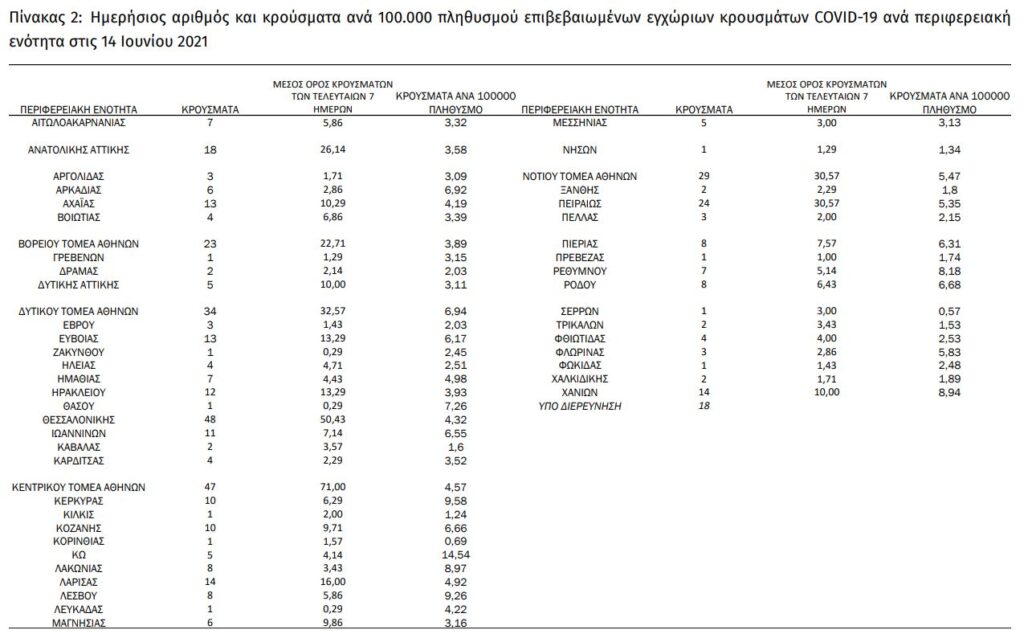 Με βάση τα επιβεβαιωμένα κρούσματα των τελευταίων 7 ημερών, 29 θεωρούνται σχετιζόμενα με ταξίδι από το εξωτερικό και 1.081 είναι σχετιζόμενα με ήδη γνωστό κρούσμα.