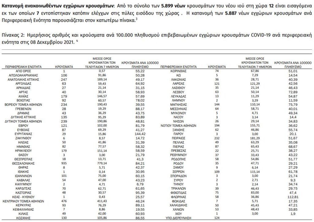 Τα νέα εργαστηριακά επιβεβαιωμένα κρούσματα της νόσου που καταγράφηκαν τις τελευταίες 24 ώρες είναι 5.899, εκ των οποίων 7 εντοπίστηκαν κατόπιν ελέγχων στις πύλες εισόδου της χώρας. Ο συνολικός αριθμός των κρουσμάτων ανέρχεται σε 984.301 (ημερήσια μεταβολή +0.6%), εκ των οποίων 50.5% άνδρες. Με βάση τα επιβεβαιωμένα κρούσματα των τελευταίων 7 ημερών, 96 θεωρούνται σχετιζόμενα με ταξίδι από το εξωτερικό και 2.536 είναι σχετιζόμενα με ήδη γνωστό κρούσμα.