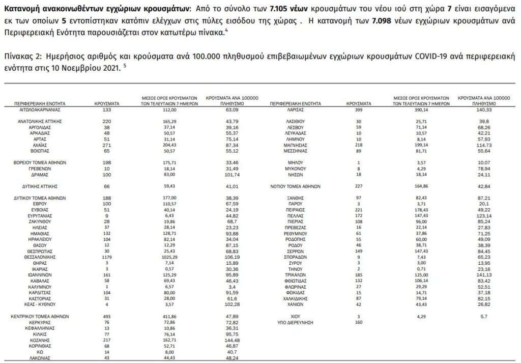 Τα νέα εργαστηριακά επιβεβαιωμένα κρούσματα της νόσου που καταγράφηκαν τις τελευταίες 24 ώρες είναι 7.105, εκ των οποίων 5 εντοπίστηκαν κατόπιν ελέγχων στις πύλες εισόδου της χώρας. Ο συνολικός αριθμός των κρουσμάτων ανέρχεται σε 808.297 (ημερήσια μεταβολή +0.9%), εκ των οποίων 50.7% άνδρες. Με βάση τα επιβεβαιωμένα κρούσματα των τελευταίων 7 ημερών, 125 θεωρούνται σχετιζόμενα με ταξίδι από το εξωτερικό και 2.472 είναι σχετιζόμενα με ήδη γνωστό κρούσμα.