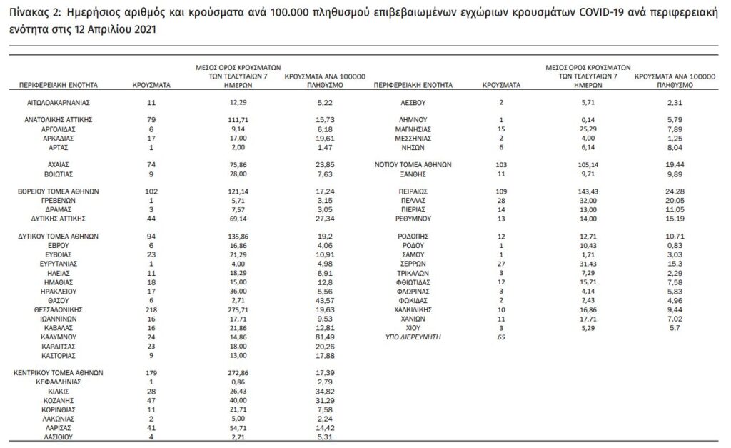 Οι νέοι θάνατοι ασθενών με COVID-19 είναι 76, ενώ από την έναρξη της επιδημίας έχουν καταγραφεί συνολικά 8.961 θάνατοι. Το 95.6% είχε υποκείμενο νόσημα ή/και ηλικία 70 ετών και άνω.
