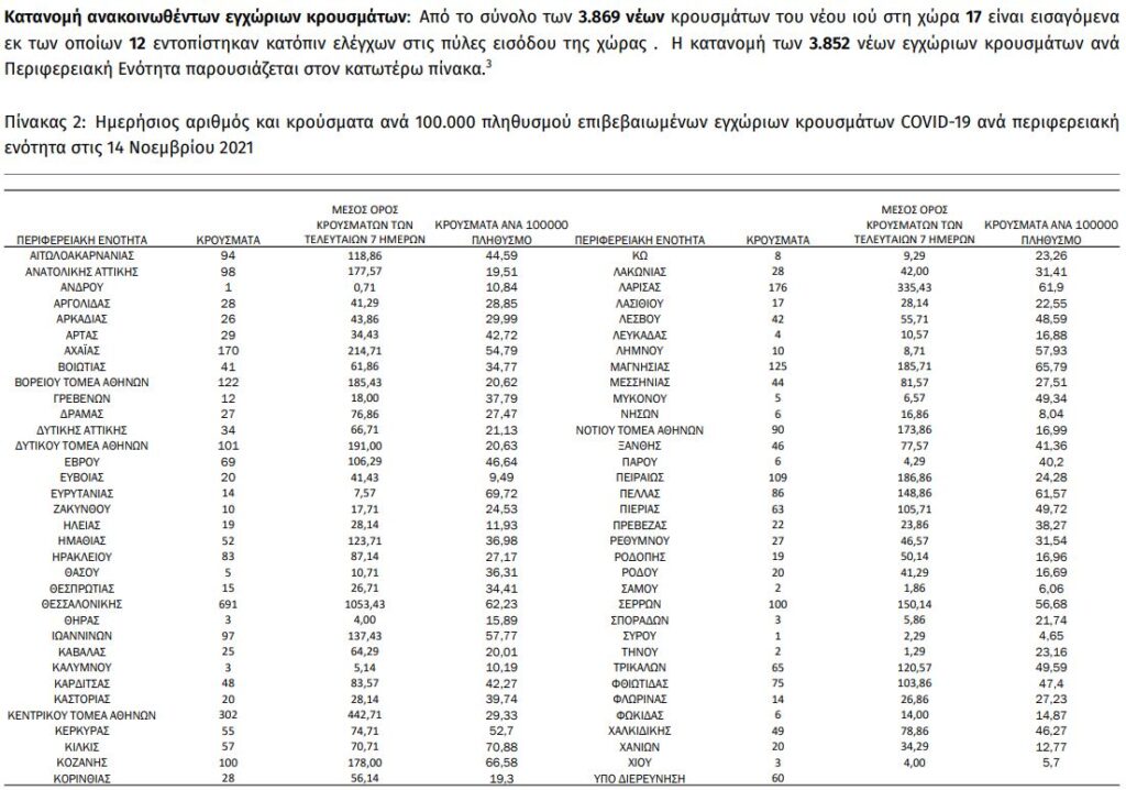 Από τα 3.869 κρούσματα (χθες 6.154), 862 εντοπίζονται στην Αττική και 691 στη Θεσσαλονίκη.