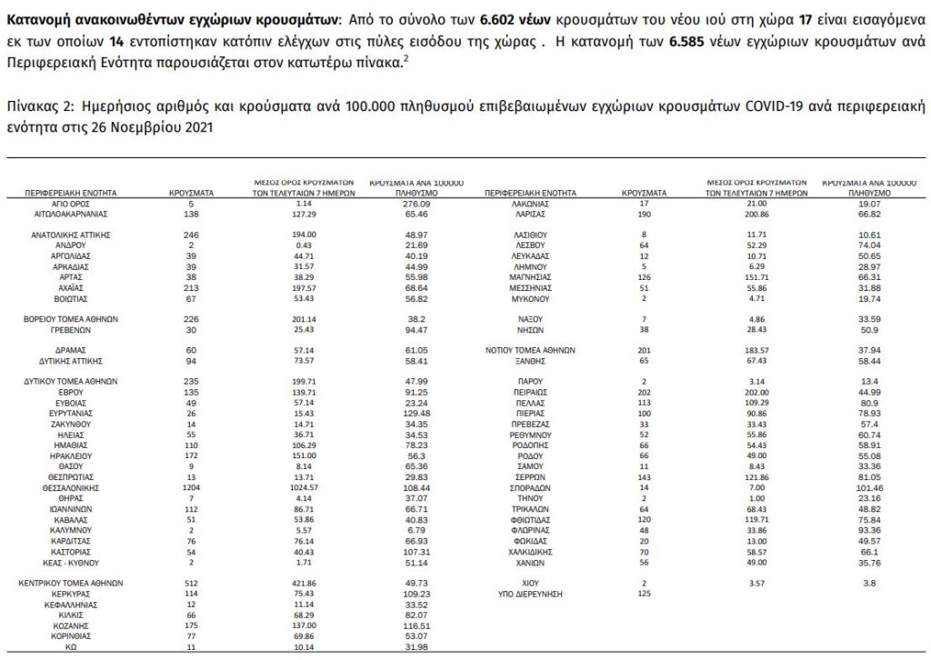 Από τα 6.602 νέα κρούσματα (χθες 6.565), 1.754 εντοπίζονται στην Αττική (χθες 1.750) και 1.204 στη Θεσσαλονίκη (χθες 1.148).