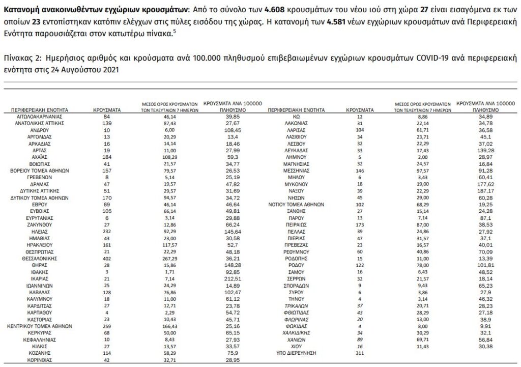 Από τα 4.608 νέα κρούσματα, στην Αττική εντοπίστηκαν 1.096 νέες μολύνσεις, στη Θεσσαλονίκη 402, στην Κρήτη 344, στην Αχαΐα 184 και στη Μεσσηνία 146.