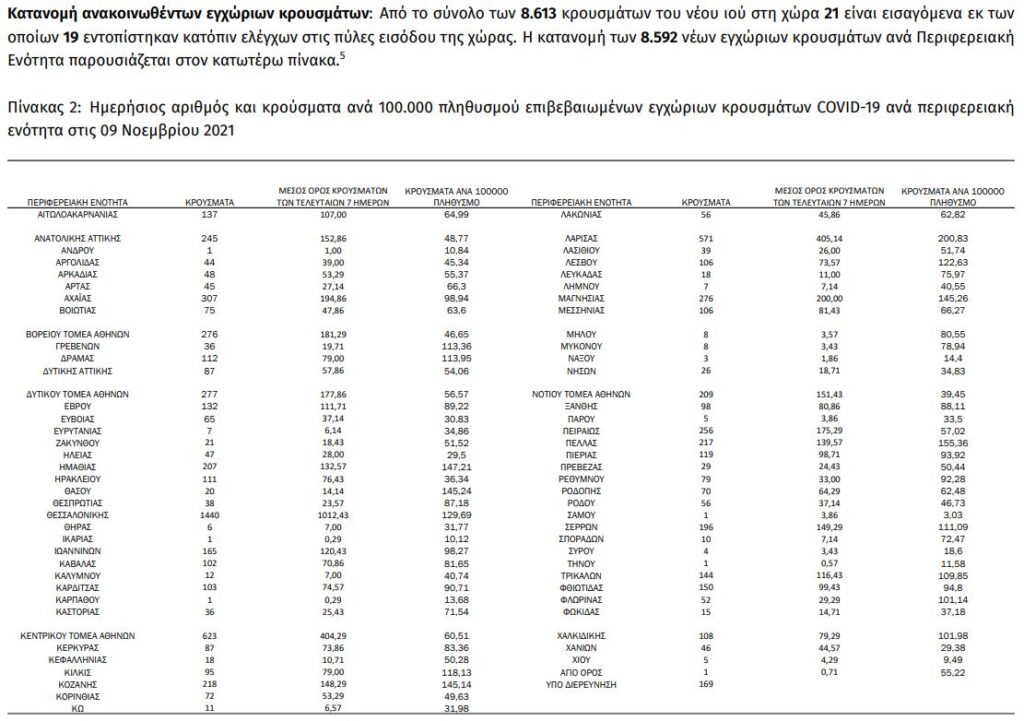 Σε 8.613 ανέρχονται τα νέα κρούσματα κορωνοϊού στη χώρα μας το τελευταίο 24ωρο, σύμφωνα με την ημερήσια επιδημιολογική έκθεση του ΕΟΔΥ. Κατά το ίδιο διάστημα, κατεγράφησαν ακόμα 46 θάνατοι ασθενών με Covid-19, με τον αριθμό των νεκρών από το ξεκίνημα της πανδημίας στην Ελλάδα να φθάνει τους 16.414.