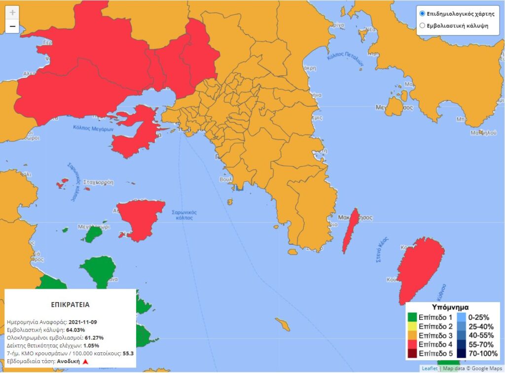 Στο «κόκκινο» βρίσκεται η Περιφερειακή Ενότητα Δυτικής Αττικής (Δήμοι Ελευσίνας, Ασπροπύργου, Μεγαρέων, Φυλής, Μάνδρας-Ειδυλλίας), όπως και τα νησιά της Σαλαμίνας και της Αίγινας.