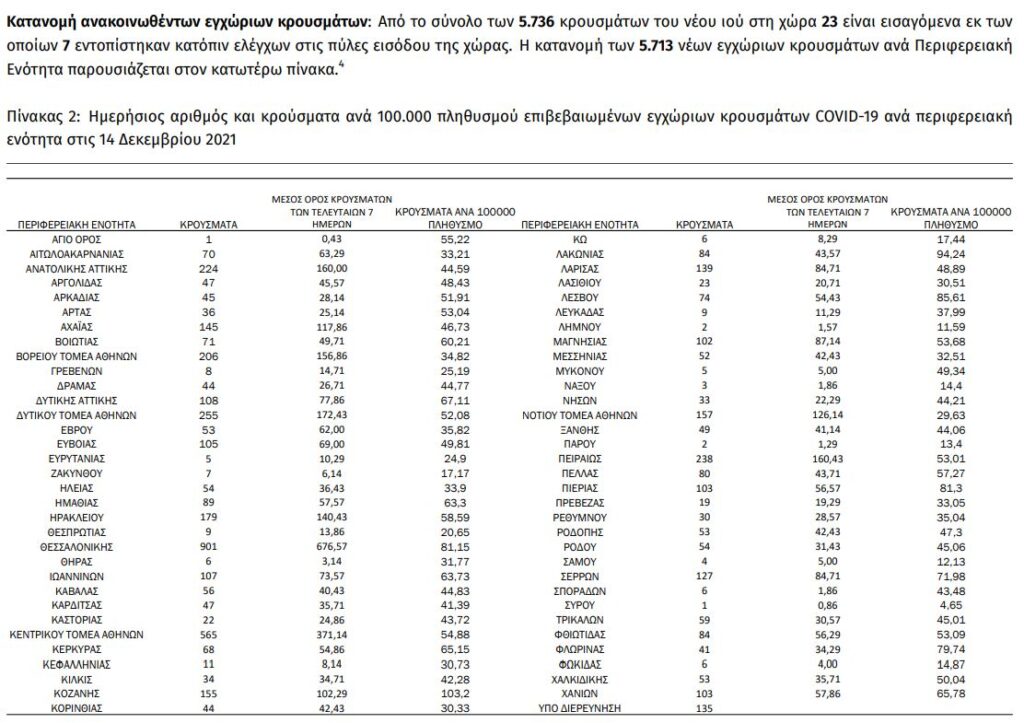 Σε 5.736 ανέρχονται τα νέα κρούσματα κορωνοϊού στη χώρα μας το τελευταίο 24ωρο, σύμφωνα με την ημερήσια έκθεση της επιδημιολογικής επιτήρησης του ΕΟΔΥ. Κατά το ίδιο διάστημα, κατεγράφησαν ακόμα 130 θάνατοι, με τον αριθμό των νεκρών από την εμφάνιση της πανδημίας να φθάνει τους 19.475.