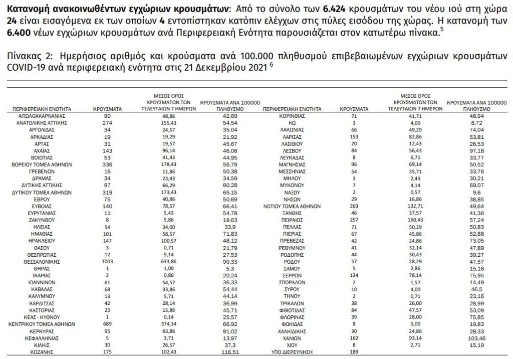 Τα νέα εργαστηριακά επιβεβαιωμένα κρούσματα της νόσου που καταγράφηκαν τις τελευταίες 24 ώρες είναι 6.424, εκ των οποίων 4 εντοπίστηκαν κατόπιν ελέγχων στις πύλες εισόδου της χώρας. Ο συνολικός αριθμός των κρουσμάτων ανέρχεται σε 1.044.301 (ημερήσια μεταβολή +0.6%), εκ των οποίων 50.5% άνδρες. Με βάση τα επιβεβαιωμένα κρούσματα των τελευταίων 7 ημερών, 211 θεωρούνται σχετιζόμενα με ταξίδι από το εξωτερικό και 2.905 είναι σχετιζόμενα με ήδη γνωστό κρούσμα.