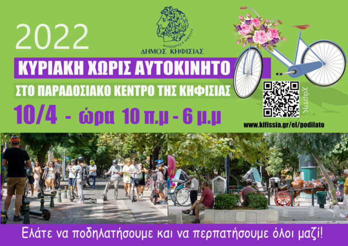 Τη δράση «Κυριακή χωρίς αυτοκίνητo» στο παραδοσιακό κέντρο Κηφισιάς διοργανώνει ο δήμος την Κυριακή 10 Απριλίου, από τις 10:00 έως τις 18:00, καλώντας τους δημότες και κατοίκους να λάβουν μέρος.