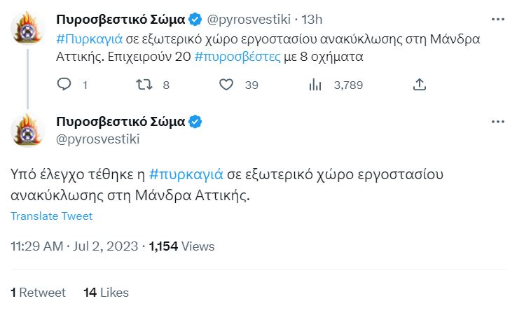 Συγκεκριμένα, η φωτιά ξέσπασε στις 05:24 έξω από τον προαύλιο χώρο εργοστασίου ανακύκλωσης στη Μάνδρα, στη θέση Ξηροπήγαδο, καίγοντας απορρίμματα και ανακυκλώσιμα υλικά.