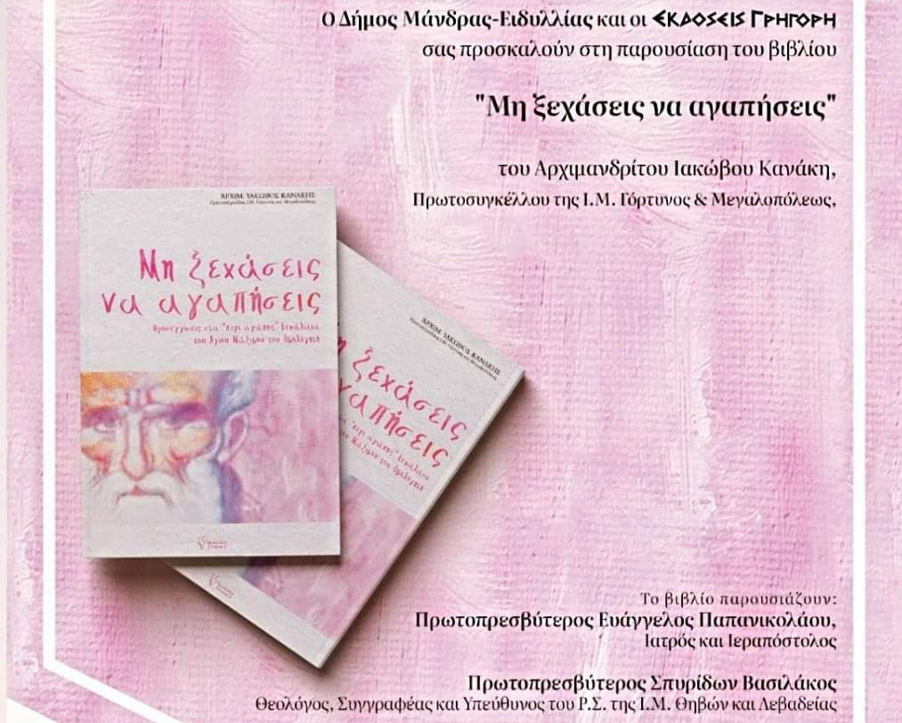Την Κυριακή 14 Μαΐου, στις 12 το μεσημέρι, στο Δημοτικό Θέατρο Μάνδρας «Μ. Μερκούρη», θα πραγματοποιηθεί η εκδήλωση παρουσίασης του βιβλίου με τίτλο «Μην ξεχάσεις να αγαπήσεις» του Αρχιμανδρίτου Ιάκωβου Κανάκη, Πρωτοσύγκελου της Ιεράς Μονής Γόρτυνος & Μεγαλοπόλεως.