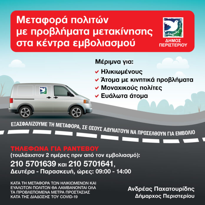 Ο Δήμος Περιστερίου μεριμνά για τη μεταφορά ηλικιωμένων, ατόμων με κινητικά προβλήματα, αλλά και μοναχικών πολιτών, προς και από τα εμβολιαστικά κέντρα της πόλης.