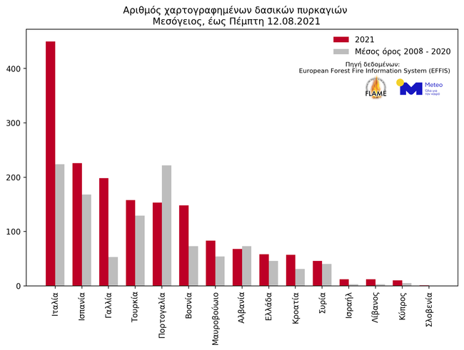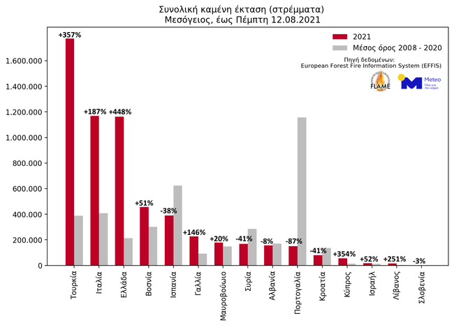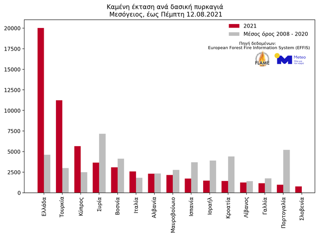 Όπως προκύπτει, σύμφωνα με το meteo, η μέση καμένη έκταση ανά δασική πυρκαγιά στην Ελλάδα ανέρχεται σε περίπου 20.000 στρέμματα το 2021, γεγονός που κατατάσσει τη χώρα μας πρώτη στη Μεσόγειο, με δεύτερη την Τουρκία.