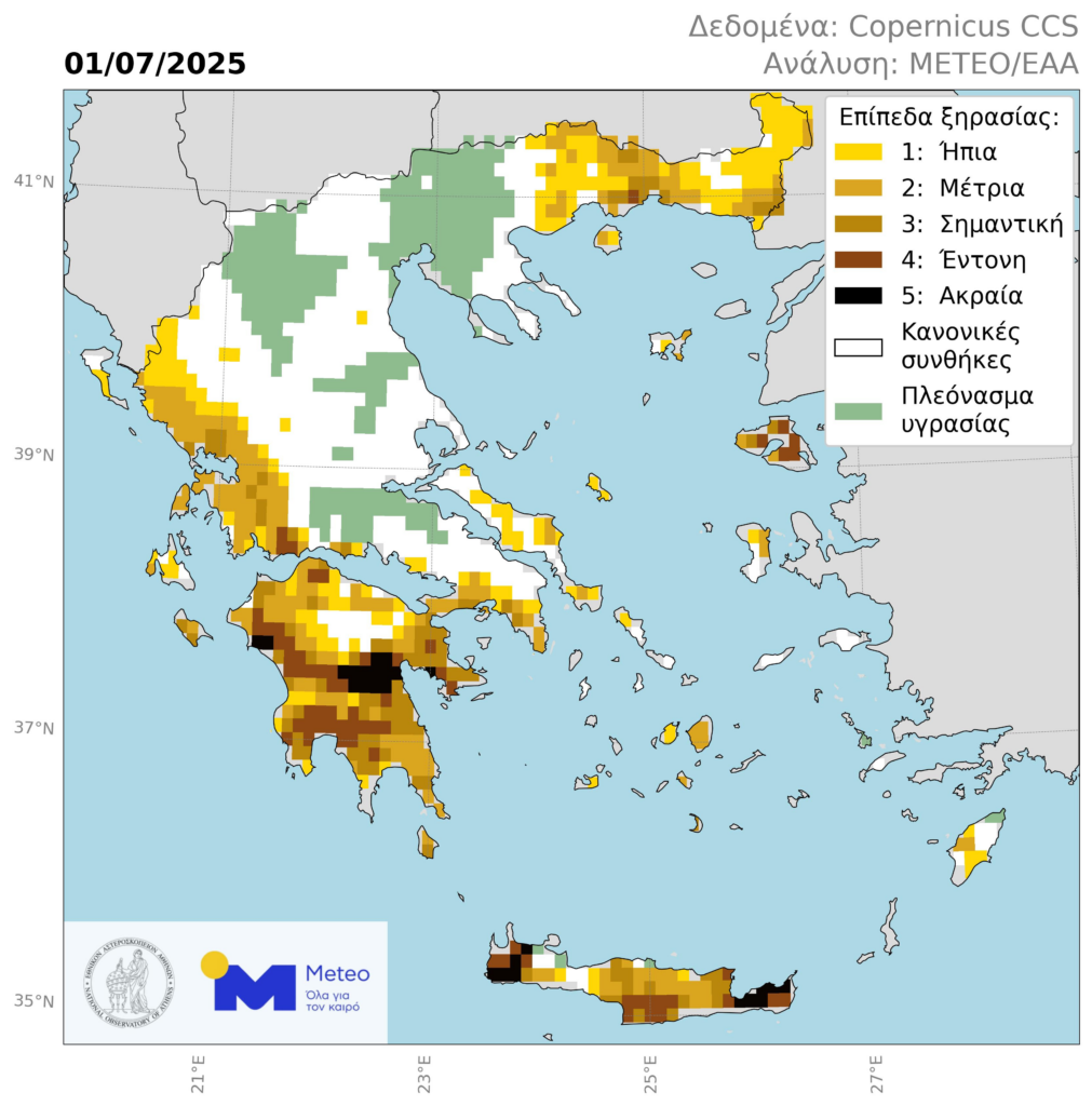 Πού παρατηρήθηκε ακραία ή έντονη ξηρασία τις πρώτες ημέρες του Ιουλίου, σύμφωνα με τον χάρτη του Meteo – Ο ξηρότερος Ιούνιος των τελευταίων ετών