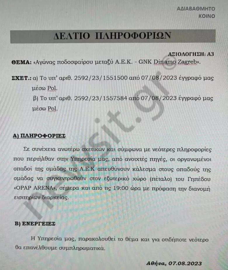 Στο πρώτο απόρρητο Ενημερωτικό Σημείωμα που αποκαλύπτει το newsit.gr, οι έμπειροι αξιωματικοί του Τμήματος Καταπολέμησης Αθλητικής Βίας που φέρει με ημερομηνία 6/8/2023, τίτλο: Αξιολόγηση: Α3 και θέμα: Αγώνας ποδοσφαιρου μεταξυ  ΑΕΚ – GΝΚ Dinamo Zagreb επισημαίνουν τα εξής αναφορικά με τις πληροφορίες που ελαβαν απο τις ξένες αρχές: