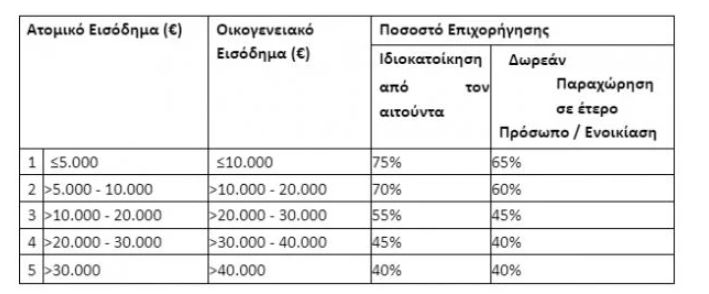 Το ποσοστό της επιδότησης είναι κλιμακωτό, ανάλογα με την εισοδηματική κατηγορία στην οποία θα ενταχθεί ο αιτών και ορίζεται ως εξής: