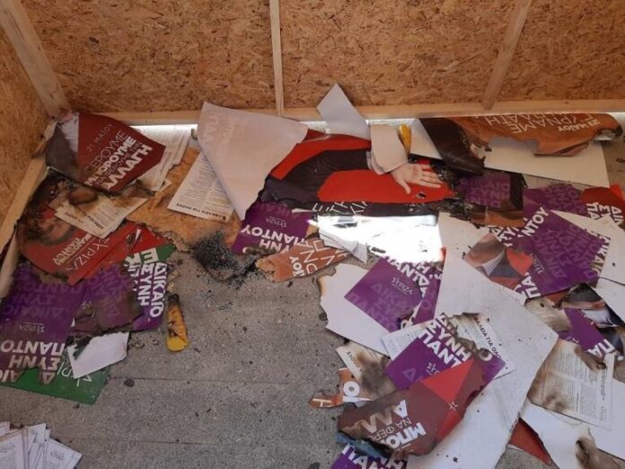 «Χθες το βράδυ άγνωστοι επιτέθηκαν και έκαψαν το εκλογικό περίπτερο του ΣΥΡΙΖΑ-ΠΣ στη Νεάπολη της Νίκαιας. Πριν λίγες μέρες στην Κόρινθο τοποθέτησαν κρεμάλες στο εκλογικό μας κέντρο.