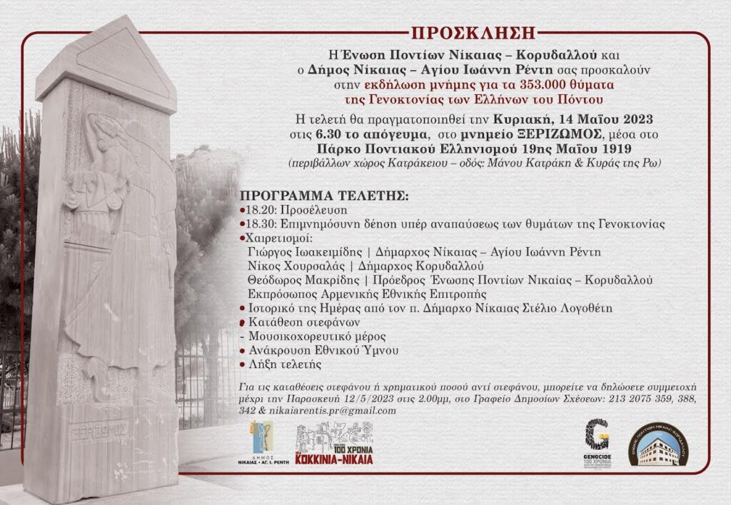 Εκδήλωση μνήμης για τα 353.000 θύματα της Γενοκτονίας των Ελλήνων του Πόντου διοργανώνει η Ένωση Ποντίων Νίκαιας-Κορυδαλλού και ο Δήμος Νίκαιας – Αγ. Ι. Ρέντη την Κυριακή 14 Μαΐου.