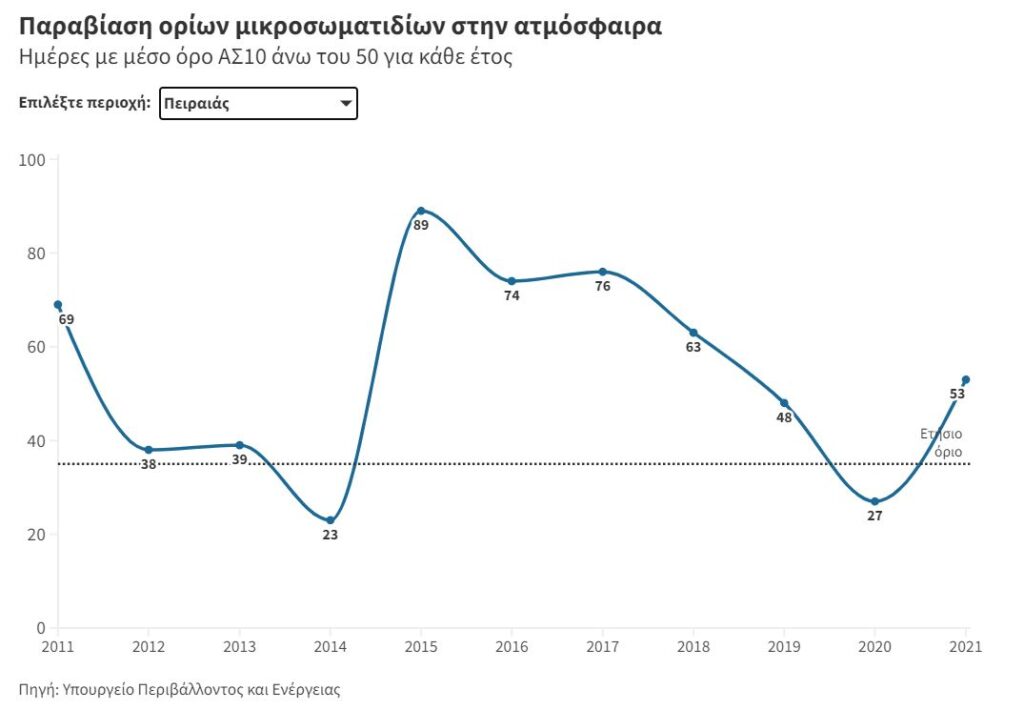 Στο Καρπενήσι από το 2016 έως το 2019 καταγράφονταν παραπάνω από 35 ημέρες του έτους με μέσο όρο που ξεπερνούσε τα 50 μg ανά κυβικό μέτρο στην ατμόσφαιρα. Άλλες περιοχές όπως η Πάτρα και η Λάρισα επίσης παρουσιάζουν υψηλές καταγραφές, ενώ η τελευταία για αρκετά έτη συγκαταλέγεται ανάμεσα στα επίπεδα Αθήνας και Θεσσαλονίκης ως προς την ποιότητα του αέρα της.