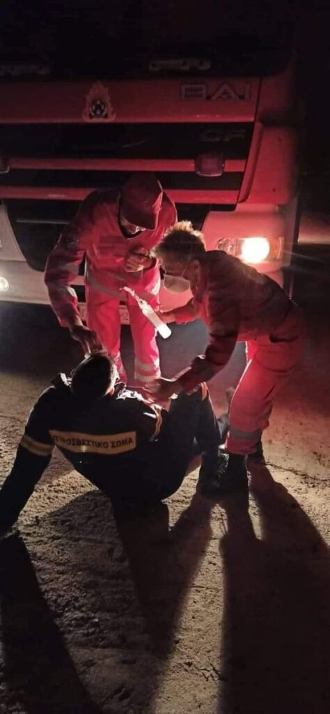 Οι εθελοντές διανυκτερεύουν στο Σταθμό Πρώτων Βοηθειών που έστησαν στις πυρόπληκτες περιοχές και παραμένουν διαρκώς στο πλευρό των πυροσβεστών και των πολιτών για να προσφέρουν τις υπηρεσίες τους.