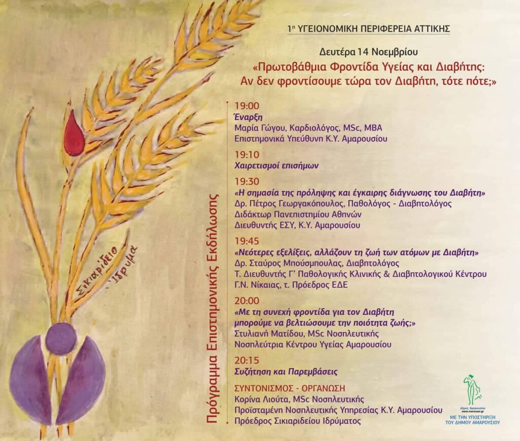 Επιστημονική εκδήλωση με θέμα: «Πρωτοβάθμια Φροντίδα Υγείας και Διαβήτης», στο πλαίσιο της Παγκόσμιας Ημέρας Διαβήτη, διοργανώνουν τη Δευτέρα 14 Νοεμβρίου το Κέντρο Υγείας Αμαρουσίου σε συνεργασία με τον Δήμο Αμαρουσίου.