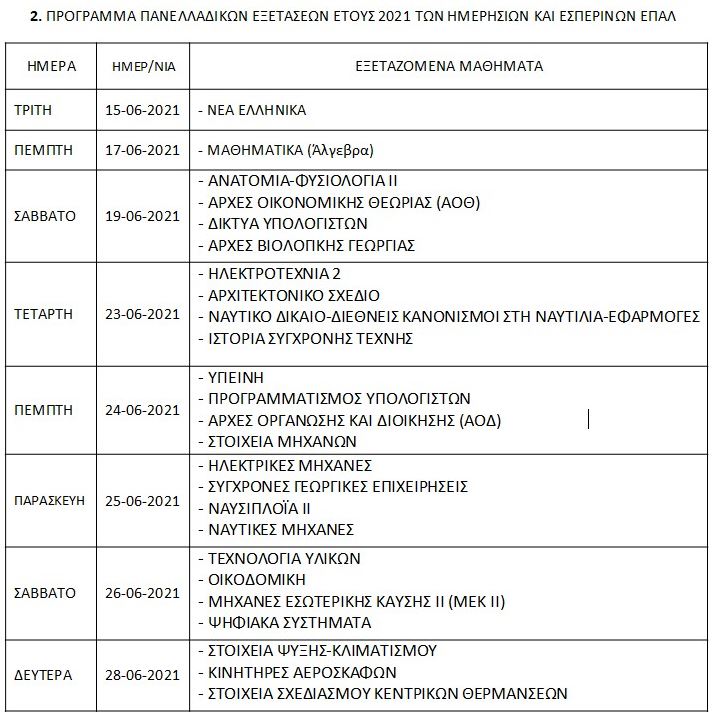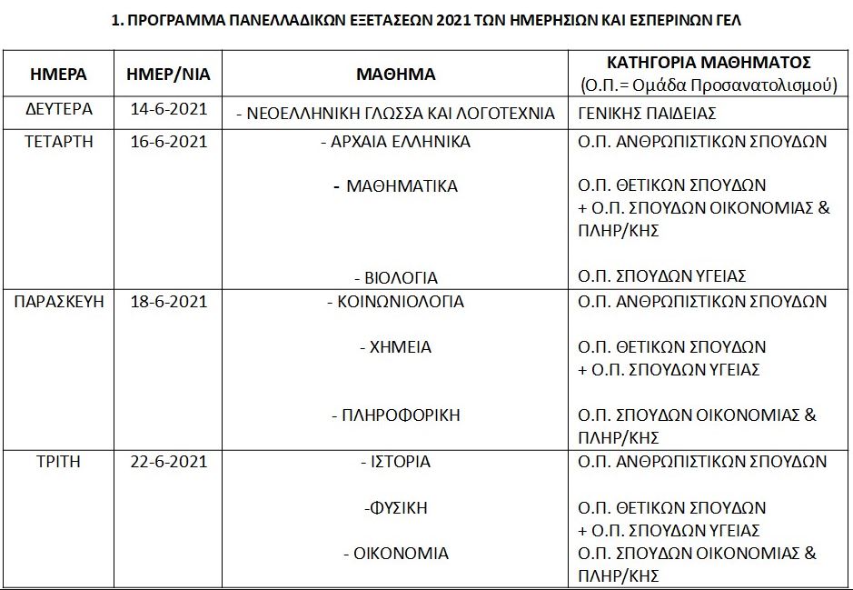 Ανακοινώθηκε από το υπουργείο Παιδείας & Θρησκευμάτων το πρόγραμμα των πανελλαδικών εξετάσεων των Γενικών Λυκείων και Επαγγελματικών Λυκείων 2021, όπως αυτό καθορίστηκε με σχετικές Υπουργικές Αποφάσεις.