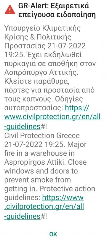 Μάλιστα, στις 19:25 εστάλη μήνυμα από το 112 στους κατοίκους και σε όσους βρίσκονται στον Ασπρόπυργο και σε κοντινή απόσταση από την περιοχή, καλώντας τους να κλείσουν παράθυρα και πόρτες λόγω των έντονων καπνών.