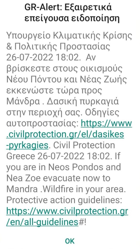 Η πυρκαγιά ξέσπασε νωρίς το απόγευμα, σε δασική έκταση και πήρε γρήγορα διαστάσεις. Μάλιστα, στις 18:02, εστάλη μήνυμα από το 112 στους κατοίκους των οικισμών Νέα Ζωή και Νέος Πόντος, προκειμένου να εκκενώσουν προληπτικά με κατεύθυνση προς Μάνδρα.