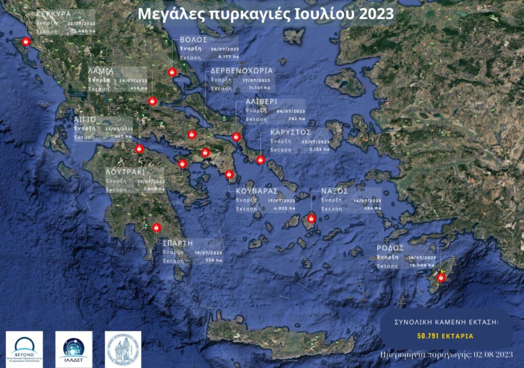 Τον Ιούλιο του 2023 κάηκαν συνολικά εκτάσεις της τάξης των 507.910 στρεμμάτων, σύμφωνα με καταγραφή της επιχειρησιακής μονάδας BEYOND, του Ινστιτούτου Αστρονομίας, Αστροφυσικής, Διαστημικών Εφαρμογών και Τηλεπισκόπησης του Εθνικού Αστεροσκοπείου Αθηνών.