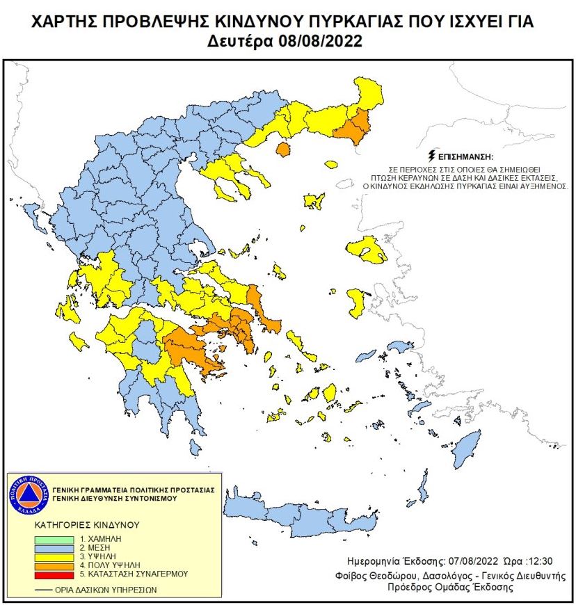 Αξίζει να επισημανθεί ότι σύμφωνα με τον Χάρτη Πρόβλεψης Κινδύνου Πυρκαγιάς που εκδίδει η Γενική Γραμματεία Πολιτικής Προστασίας του Υπουργείου Κλιματικής Κρίσης & Πολιτικής Προστασίας, για τη Δευτέρα 8 Αυγούστου, προβλέπεται πολύ υψηλός κίνδυνος πυρκαγιάς (κατηγορία κινδύνου 4) για τις εξής περιοχές: