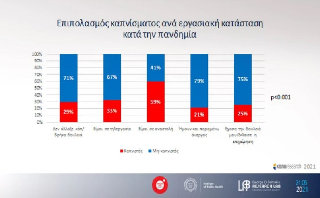 Ωστόσο, ο κ. Μπεχράκης επισήμανε πως «η πανδημία συνδυάζεται με μικρού βαθμού αύξηση επιπολασμού καπνίσματος, ιδίως των περιστασιακών καπνιστών και ιδιαίτερη αύξηση επιπολασμού καπνίσματος στους εργαζόμενους που τέθηκαν σε αναστολή εργασίας», σύμφωνα με τα στοιχεία έρευνας γνώμης της ΚΑΠΑ research που έγινε σε 1.264 άτομα στις 13 περιφέρειες της χώρας. Η έρευνα έδειξε επίσης ότι υπήρξε μεταβολή της καπνιστικής συμπεριφοράς και του τύπου των χρησιμοποιούμενων καπνικών προϊόντων.
