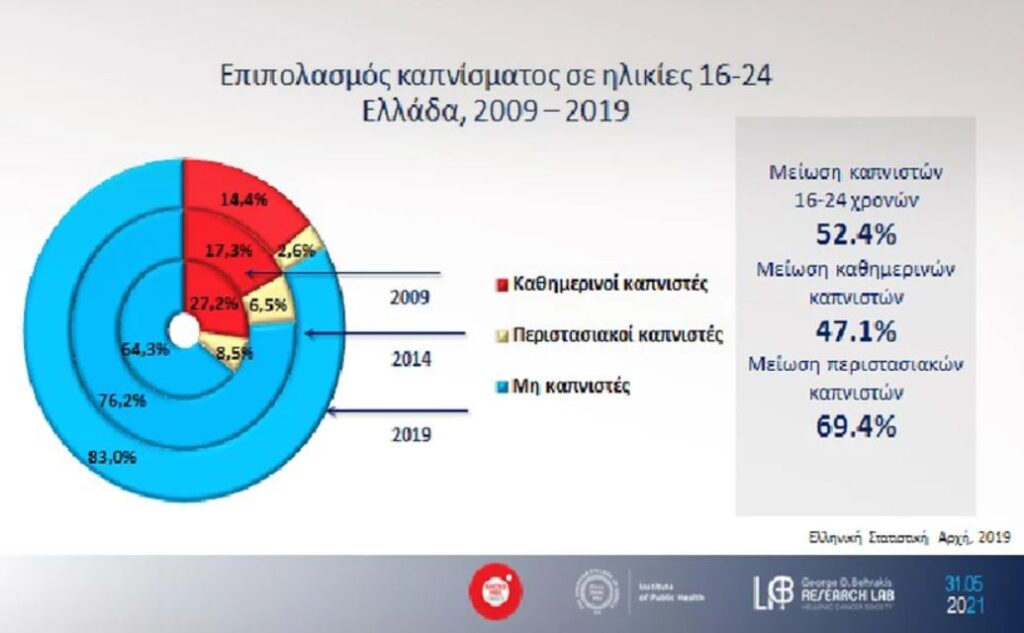 Σημαντική μείωση της χρήσης καπνικών προϊόντων στην Ελλάδα κατά τη δεκαετία 2009-2019, ιδιαίτερα στους νέους ανθρώπους, δείχνουν όλα τα στοιχεία που παρουσιάστηκαν το βράδυ της Δευτέρας στο αμφιθέατρο του Μουσείου της Ακρόπολης, σε ειδική εκδήλωση για τη σημερινή Παγκόσμια Ημέρα κατά του Καπνίσματος.