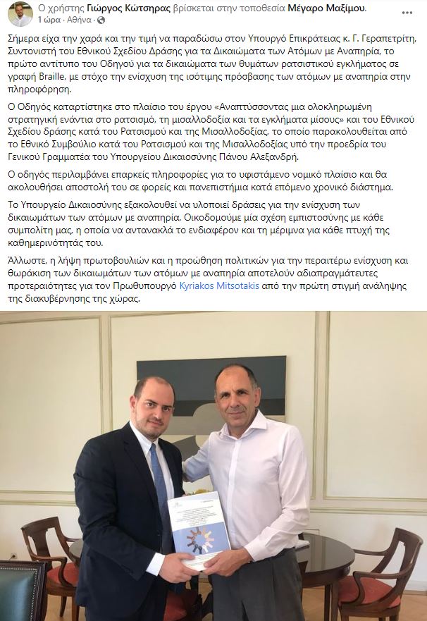 Συνάντηση με τον υπουργό Επικρατείας, Γιώργο Γεραπετρίτη, είχε το πρωί της Τρίτης στο Μέγαρο Μαξίμου ο υφυπουργός Δικαιοσύνης, Γιώργος Κώτσηρας, με σκοπό να παραδώσει συμβολικά το πρώτο αντίτυπο του Οδηγού για τα δικαιώματα των θυμάτων ρατσιστικού εγκλήματος σε γραφή Braille.