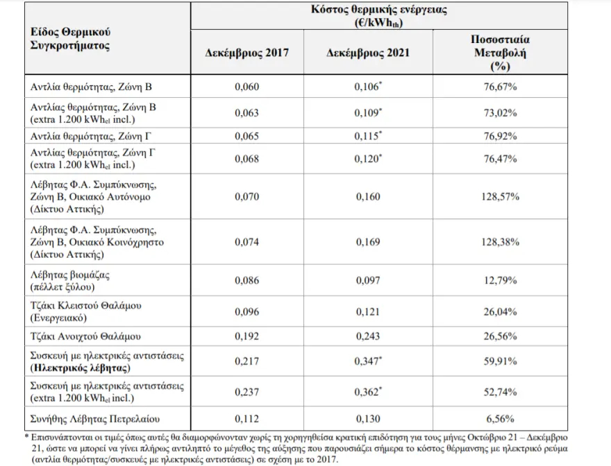 Πάντως, χαρακτηριστική των αλλαγών είναι η σύγκριση μεταξύ των τιμών που ισχύουν σήμερα με το κόστος θέρμανσης προ τετραετίας: το φυσικό αέριο έχει αυξηθεί 128%, η αντλία θερμότητας έχει αυξηθεί πάνω από 73%, η θέρμανση με συσκευές ηλεκτρικών αντιστάσεων έχει αυξηθεί 59% ενώ η θέρμανση με συνήθη λέβητα πετρελαίου έχει αυξηθεί 6,56%.