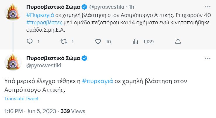 Υπό μερικό έλεγχο τέθηκε η πυρκαγιά που ξέσπασε νωρίτερα, το πρωί της Δευτέρας (5/6), σε χαμηλή βλάστηση στην επαρχιακή οδό Φυλής – Ασπροπύργου.